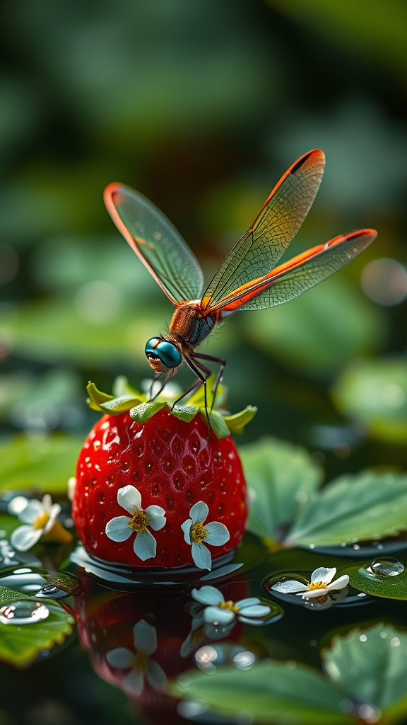 A breathtakingly detailed dragonfly, its wings iridescent and eyes gleaming with intricate nuances, rests gently atop a luscious, ripe strawberry and its dainty white flowers. The scene is set in a miniature natural pond where delicate dew drops catch and reflect the surrounding light, creating sparkling accents all around. This vivid tableau is enveloped in a tranquil, emerald paradise rich with lush flora. The interplay of bokeh effects adds an enchanting blur in the background, enhancing the dreamy depth and ethereal dimension of this captivating moment. Subtle shifts in light and shadow dance across the scene, emphasizing the mesmerizing array of colors and textures.
