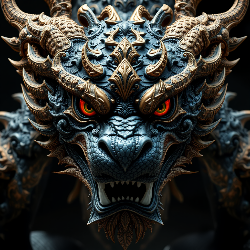 A breathtakingly detailed image of a fierce singha, facing forward with eyes locked in intensity, showcasing intricate and hyper-realistic details. Incorporating rich mythological elements from Thailand, the creature exudes a dragoncore aesthetic with dark fantasy undertones reminiscent of Antonio J. Manzanedo's style. The composition captures an awe-inspiring blend of mythical and natural elements, with ultra-refined textures and patterns that enhance its majestic presence.