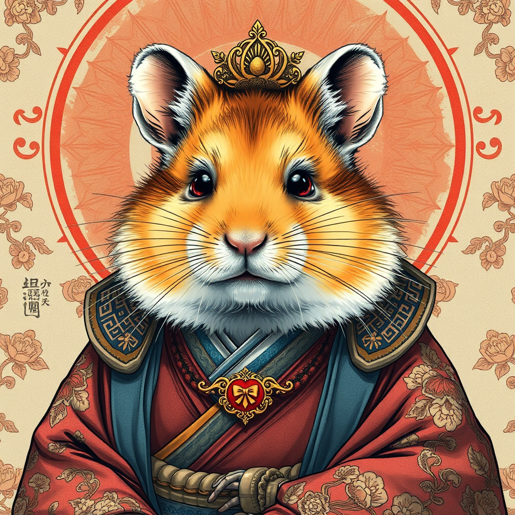 A breathtakingly detailed portrait of a hamster elegantly dressed as a feudal Japanese emperor, centered and rich in intricate, precise linework. In the style of Carne Griffiths and Conrad Roset, this key visual captures vibrant colors and a comprehensive cinematic feel. The artwork exudes beauty and charm, with an emphasis on intricate robes and delicate patterns. Avoiding any signs of technical errors or deformities, the composition showcases flawless anatomy, maintaining a clean and polished aesthetic without any distractions such as signatures, watermarks, or text.