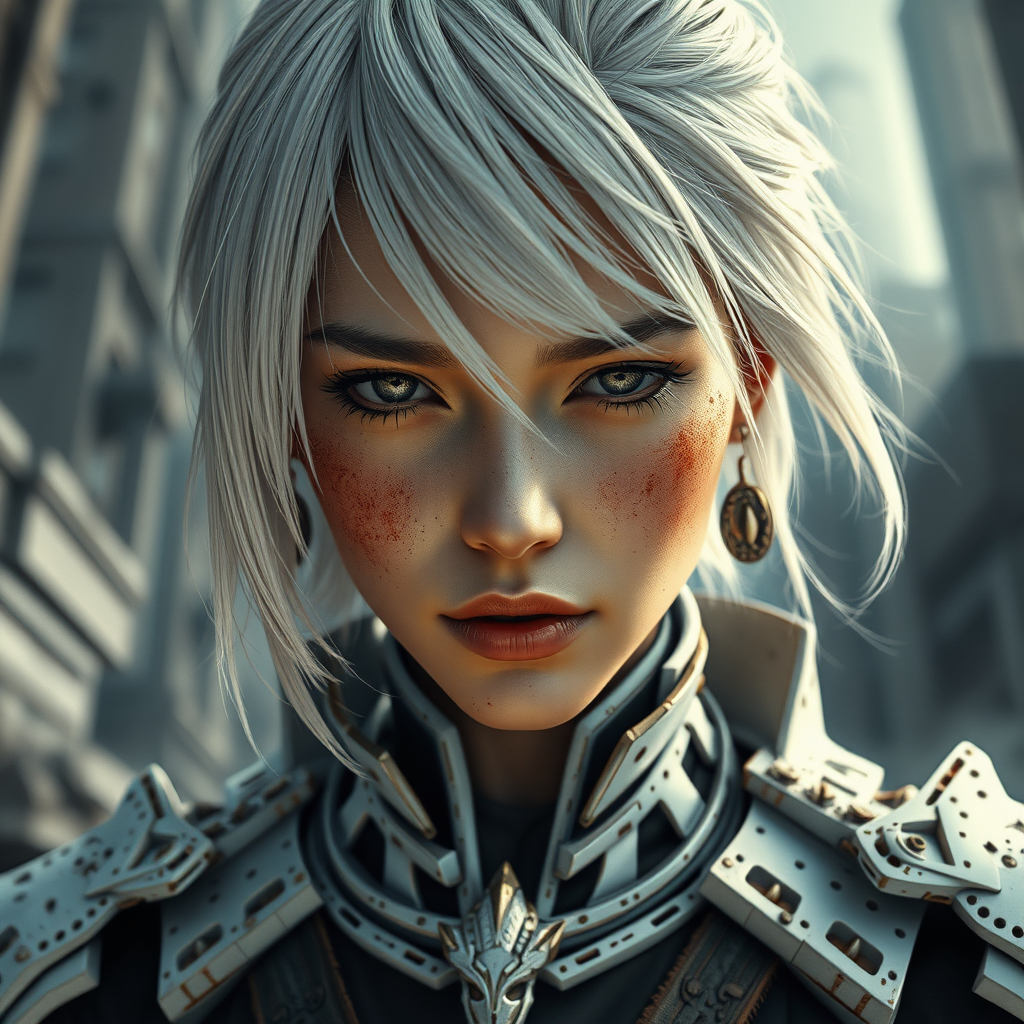 A breathtakingly fierce female warrior, captured in digital art with unparalleled quality and ultra-realistic detail, presented from a low camera angle in a half-body portrait. She wears an intricately designed, minimalistic porcelain exo-skeleton, exuding an air of strength and elegance as she gazes down with piercing, clear eyes. Her asymmetric white hair accentuates her gorgeous and kind visage, smeared with dirt and enveloped in a veil of fog. Her beauty, both natural and magnificent, is set against the backdrop of a desolate futuristic city. The ambiance is heightened by dramatic volumetric lighting, highlighting her flawless form and the authentic texture of her skin amidst the ruin.