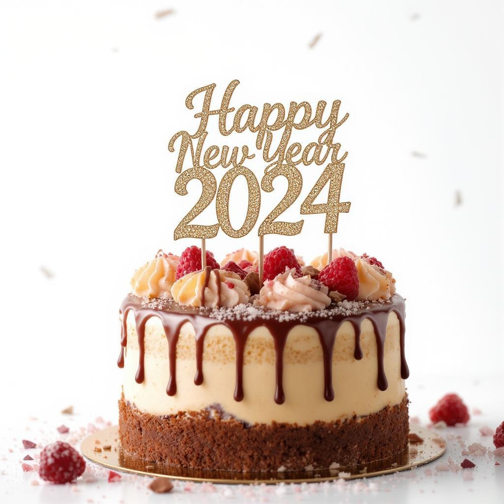 A breathtakingly realistic close-up portrait of a New Year's 2024 celebration cake, captured with a Canon SL3 DSLR in stunning high resolution. The cake, adorned with intricate decorations and a sparkling "Happy New Year 2024" topper, sits against a pristine white backdrop. Shot with a 50mm standard lens, the image is bathed in soft, natural lighting that emphasizes its detailed textures and rich colors. The composition is cinematic, boasting a perfect blend of dynamic lighting and meticulous detailing, resulting in a digital masterpiece of 8k and 4k HD quality. The scene radiates warmth and festivity, capturing the essence of a joyous occasion in unparalleled 32K clarity. This high-quality graphic image is not just a snapshot, but a vibrant digital painting that embodies the start of a promising new year.