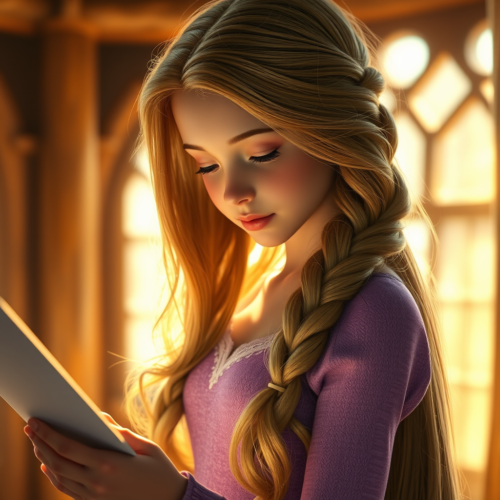 A breathtakingly realistic depiction of Rapunzel inspired by Tangled, portrayed as a real girl with shimmering long hair woven into a thick braid, absorbed in illustrating her tower. The image captures her surrounded by the soft glow of natural sunlight, highlighting her delicate features and intricate details in ultra-realistic 8k quality. With a focus on photorealism, the composition remains epic and masterful, portraying her in a moment of serene creativity amidst the warm, inviting atmosphere of her tower room.
