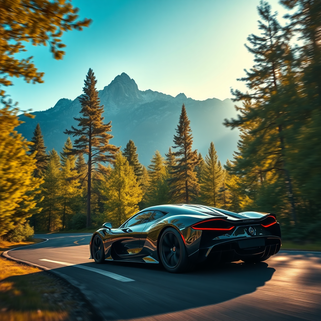 A breathtakingly realistic image of a luxurious hyper car effortlessly gliding along a winding forest road, enveloped by towering trees with lush green foliage. The majestic mountains loom in the background under a clear blue sky, adding contrast and depth. The scene is bathed in warm, golden hour light, enhancing the intricate details of the hyper car's glossy reflective surface and casting dramatic shadows. Incredibly sharp textures depict every leaf and every inch of the car's sleek design, capturing an unparalleled sense of speed and freedom. 8K resolution, HDR, 4K Ultra detail.
