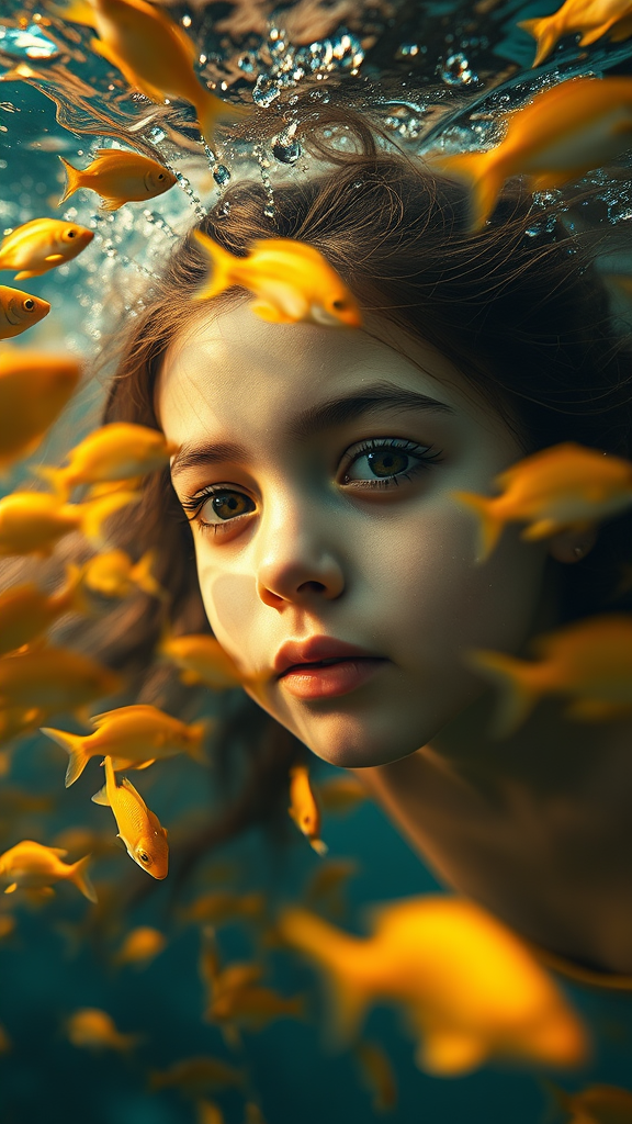 A breathtakingly realistic photograph captures a young girl submerged underwater, surrounded by a swirling school of shimmering golden fish. The closeup shot evokes a dreamy mood, with delicate reflections and bokeh effects adding depth and magic. Soft, golden hour lighting illuminates the girl's serene face, enhancing the tranquil beauty of the scene. The entire composition feels almost too exquisite to be true, as if caught in a moment of ethereal splendor. The environment is filled with a gentle sense of chaos, as the fish dance around with unpredictable grace, and the scene stands out in stunning 8k detail.