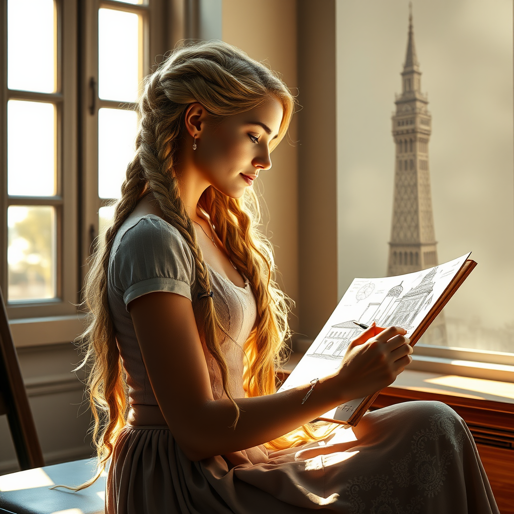 A breathtakingly realistic portrayal of a beautiful young woman with long, flowing braids reminiscent of Rapunzel from Tangled, seated in a sunlit room as she intently sketches the intricate details of the towering structure surrounding her. The scene captures the essence of natural lighting with sunlight streaming gracefully through an open window, casting delicate shadows. The composition is epic in its detail and photorealism, with lifelike textures and colors that make every element come alive in stunning 8k resolution. Her expression is a blend of creativity and contemplation, adding depth to the masterpiece.