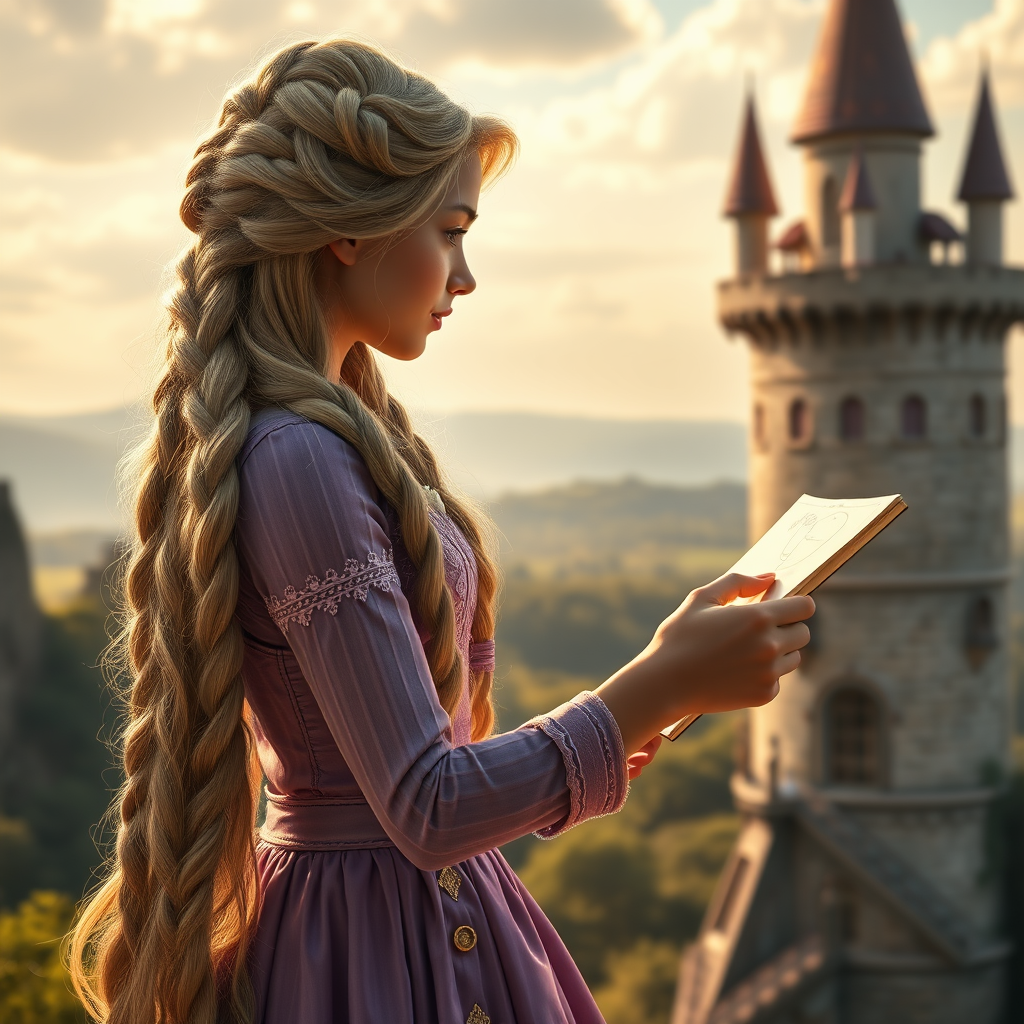 A breathtakingly realistic portrayal of Rapunzel from Tangled, depicted as a stunning real girl with a long, intricate braid, as she sketches her enchanting tower, ultra-realistic 8k resolution capturing every detail, bathed in soft, natural sunlight that highlights her ethereal beauty, a true masterpiece of photorealism with an epic composition that evokes a sense of wonder and serenity.
