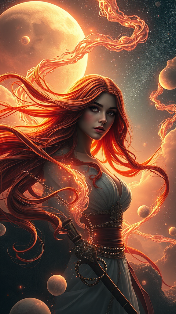 A breathtakingly surreal airbrushed masterpiece depicting dopamine cascading from Venus, weaving its way through the cosmos to merge with a stunning red-haired warrior girl. Created with the advanced craftsmanship of CGSociety and Unreal Engine, this 8K render showcases impeccable CGI and concept art, capturing celestial textures in detail that amplifies the dreamlike aura. Bathed in the ethereal hues of a Dutch golden hour, the scene exudes a soft ambient glow that enhances the mystical ambiance. The young warrior, resplendent and fierce, stands central, her flowing crimson hair entwined with the cosmic stream. Inspired by the emotive works of Ilya Kuvshinov, Artgerm, Alphonse Mucha, and Greg Rutkowski, this visual symphony is trending on ArtStation, synthesizing elements of dreamlike art with modern digital techniques to transcend conventional imagination, offering a harmonious balance of realism and fantasy.