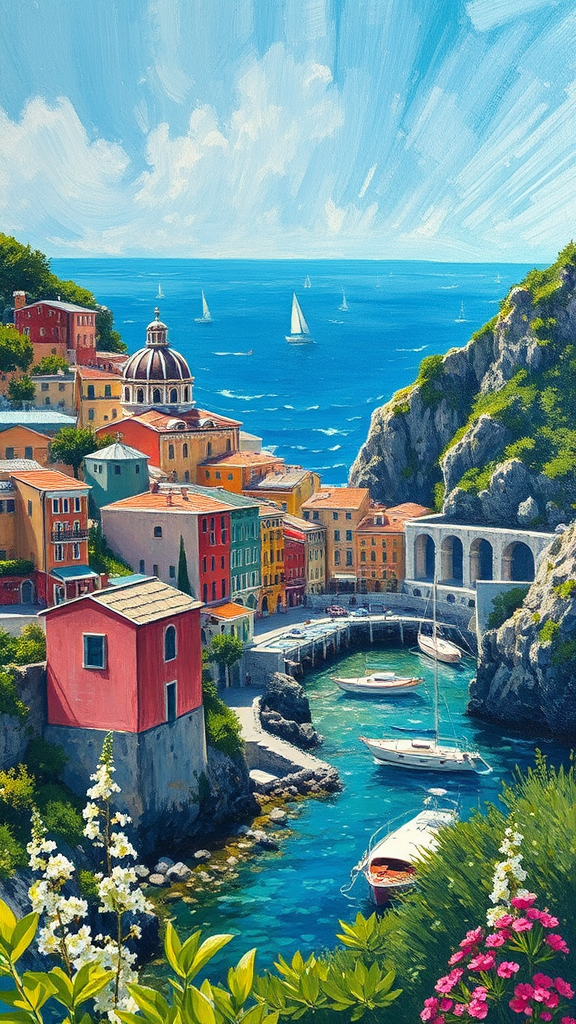 A bright day on the Amalfi Coast captured as an oil painting in impressionist style, featuring vibrant and colorful buildings with ornate domes perched above the crystal-clear sea. Sailboats gently dot the horizon, while lush, green cliffs frame the scene. The painting bursts with vivid colors, showcasing intricate brushstrokes and a rich textured canvas effect, embodying the impressionistic technique. The artwork is depicted in high resolution, with an aspect ratio of 1:2, emphasizing the expansive view of the coastal panorama.