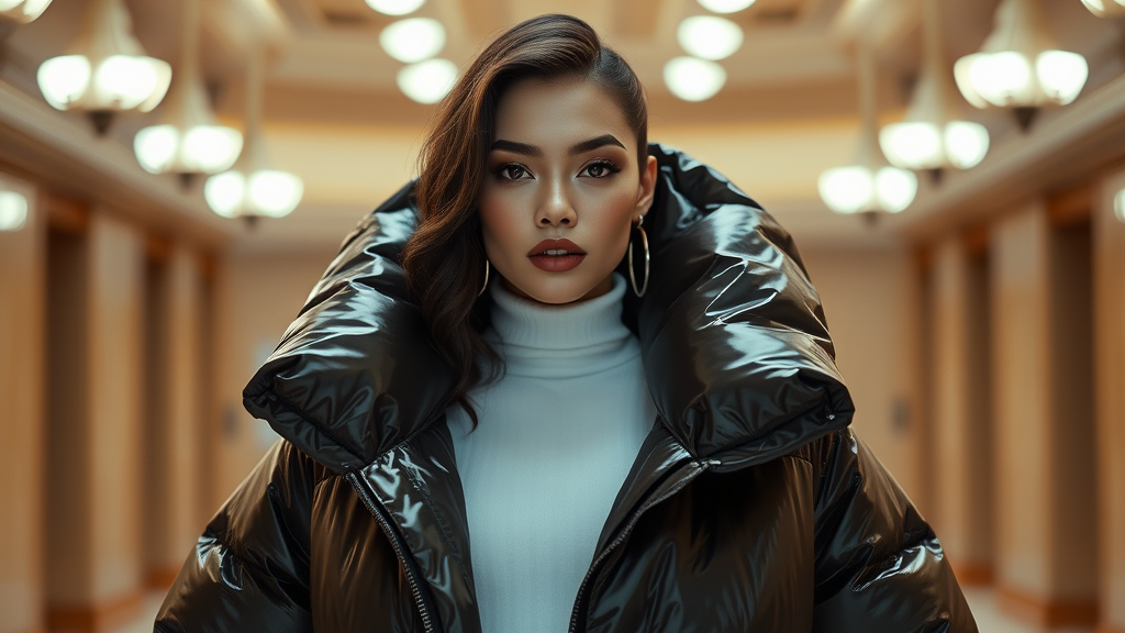 A brightly lit fashion editorial featuring an exceptionally stunning woman in a dramatically oversized puffer jacket by renowned designers Craig Green, Dingyun Zhang, Yeezy, Balenciaga, and Vetements, showcased with sharp focus and clear, intricate detailing. The setting exudes a cinematic and glamorous vibe, with a symmetrical composition reminiscent of a Vogue magazine shoot. The glossy finish and editorial style highlight the luxurious feel of Off-White, creating a striking visual that embodies elegance and cutting-edge fashion.