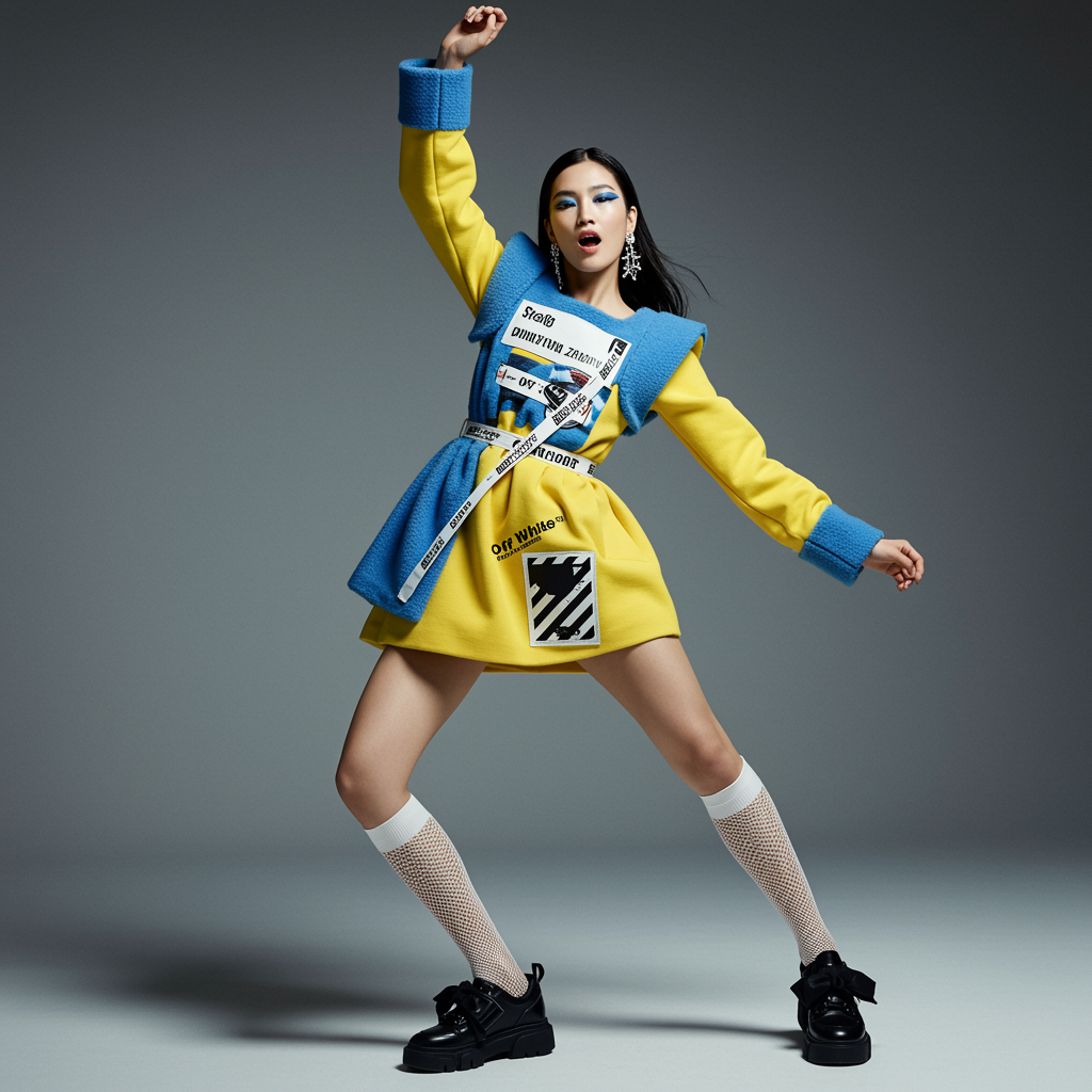 A brightly lit, full-body fashion shoot showcasing an exceptionally stunning female model striking an energetic pose. She is clad in a unique and stylish ensemble combining a yellow and blue dress with elements designed by Craig Green, Dingyun Zhang, Yeezy, Balenciaga, and Off-White. The scene is captured in sharp focus with a cinematic quality, emphasizing clarity, intricate details, and a glamorous aesthetic. The composition is symmetrical and exudes the sophistication of a high-fashion Vogue editorial spread.