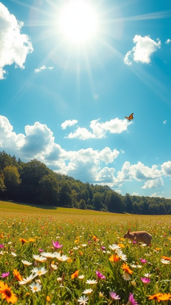 A brilliantly bright spring landscape stretches out, with the viewer standing on a blooming meadow, a dense forest at their back. The sun beams down, the sky a radiant blue adorned with scattered fluffy clouds. An aura of boundless freedom and optimism fills the air. A butterfly flutters by, a field hare hops across the meadow. The viewer's gaze lifts skyward, a sense of wonder and contentment in the air. They breathe deeply, ready to embrace the day and its challenges with joy and confidence.
