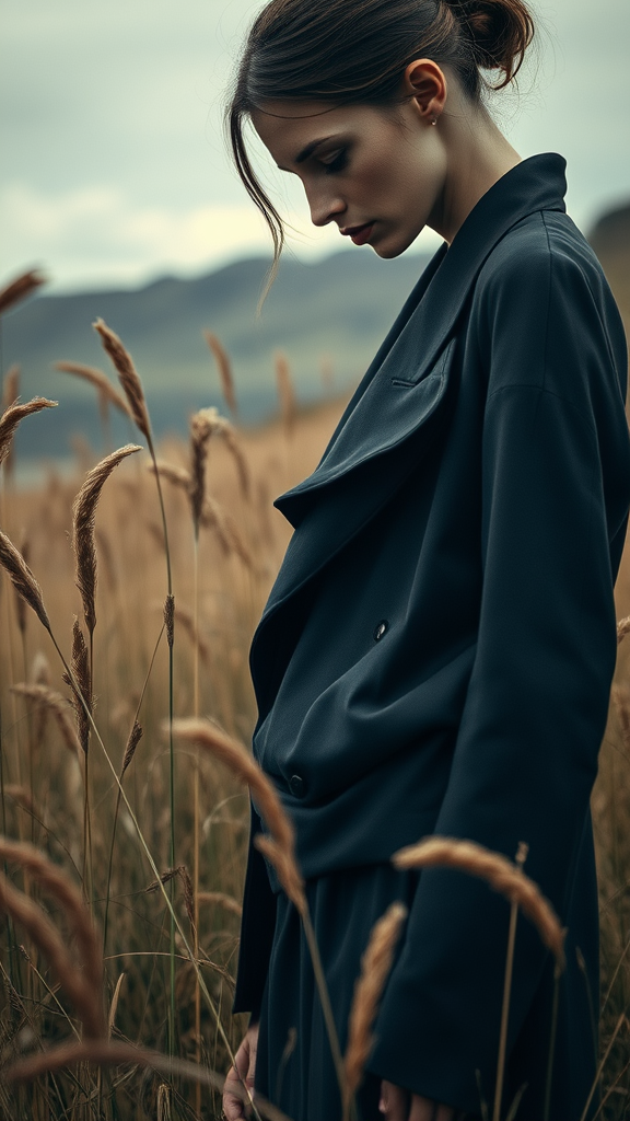 A brooding figure stands amidst the tall, whispering grass of a Scottish landscape, their head slightly bowed. The scene is imbued with the hues of light bronze and deep blue, casting a melancholic yet sophisticated air. The subject's attire reflects an avant-garde, deconstructed approach to tailoring, blurring the lines of gender in its flowing, structured elegance. The close-up captures the intricate details of the fabric against the natural textures, inviting contemplation. The overarching mood is contemplative, weaving together elements of fashion photography with the mystique of Scotland's rugged beauty.
