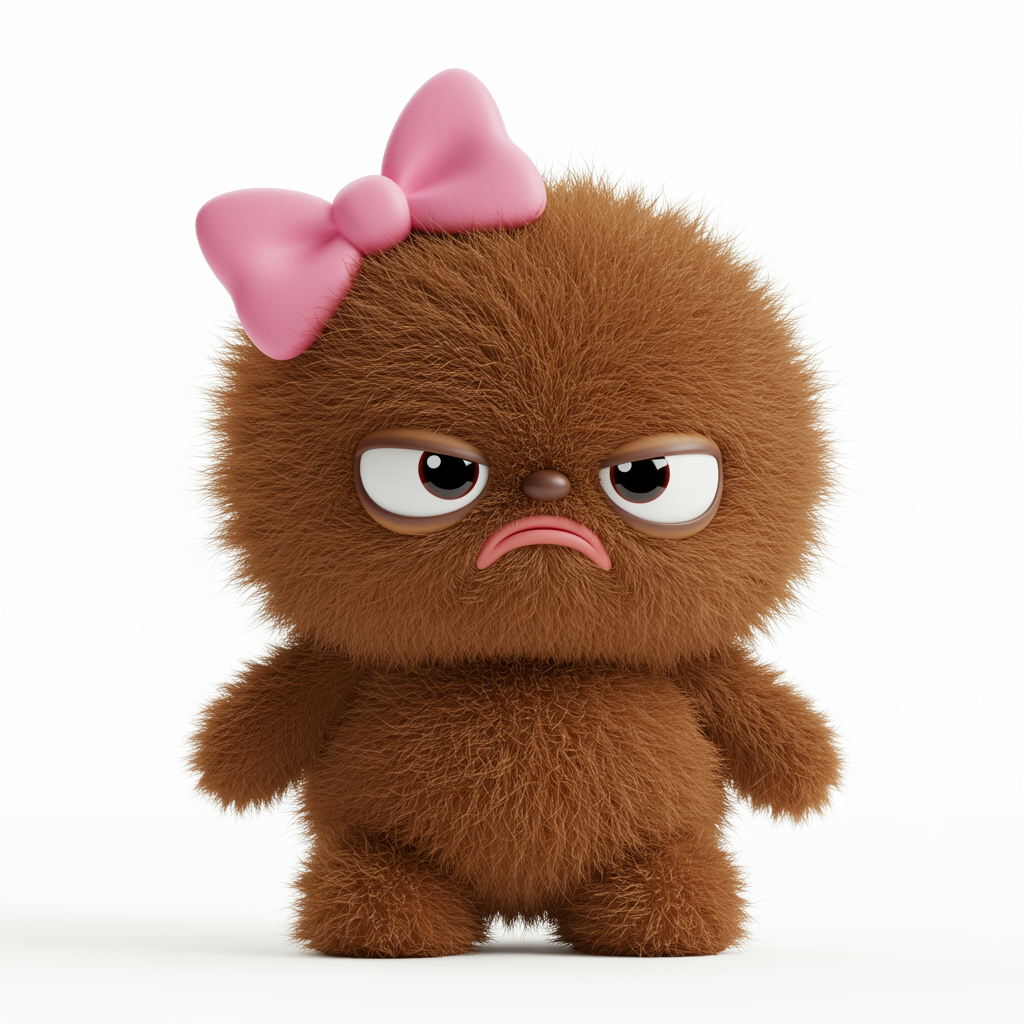 A brown, fluffy character with a pink bow and an expression of extreme distaste on a plain white background.