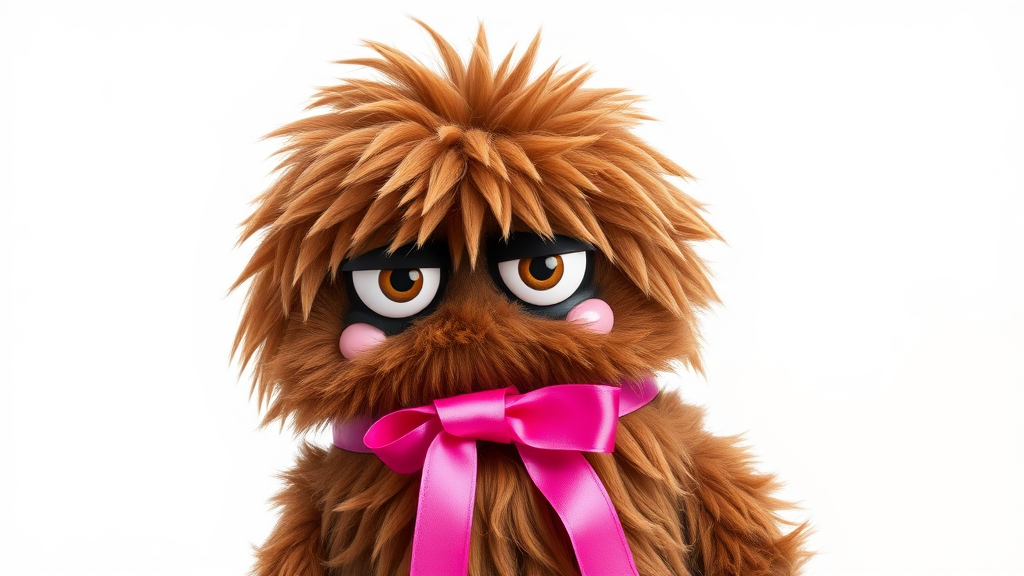 A brown, fluffy character with a very disgusted expression, adorned with a bright pink ribbon on a plain white backdrop.