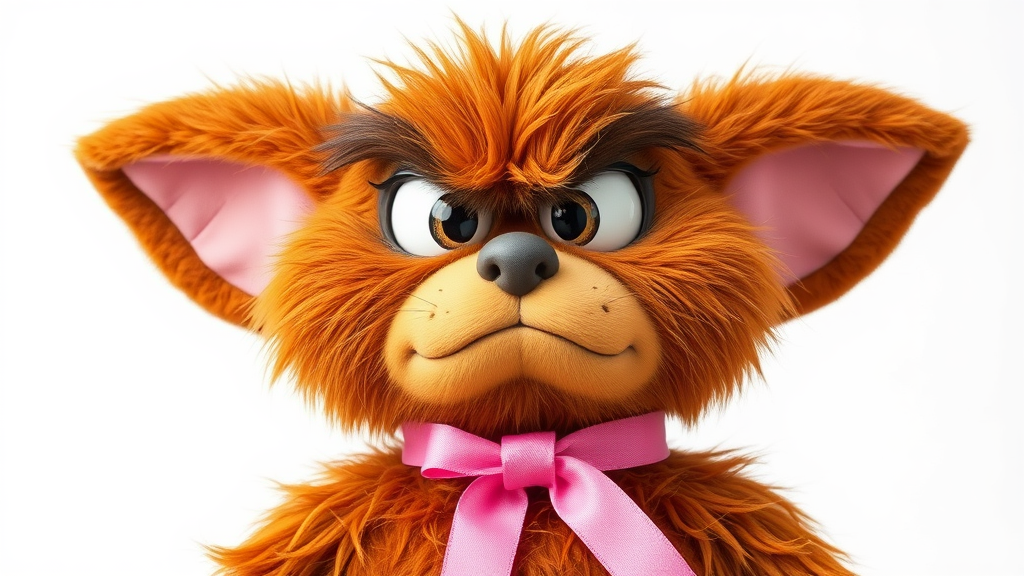 A brown furry character with a look of extreme distaste, adorned with a bright pink ribbon around its neck, set against a plain white backdrop.