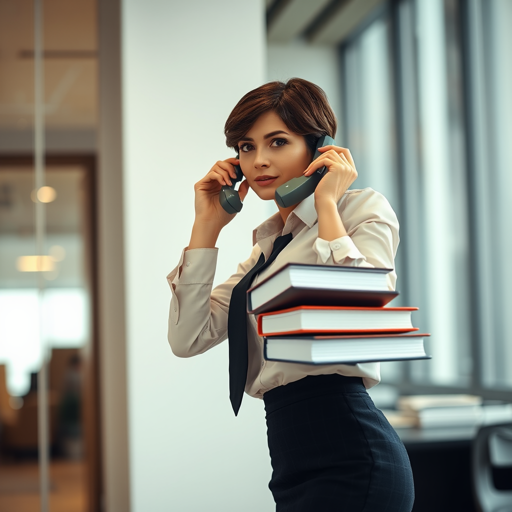 A brunette woman with short hair in a modern office, answering the telephone while wearing a tailored skirt and blouse, gracefully holding a stack of notebooks. She walks confidently towards the camera, portrayed in a low angle shot. The scene is detailed and elegant, captured in the best quality with diffused broad light, subtle backlighting, and a gentle bloom effect. Light sparkles and slight chromatic aberration add a dreamy quality. The composition is smooth with sharp focus, highlighting her dynamic pose. Her detailed eyes convey depth and clarity, enhancing the image's overall sophistication and focus.