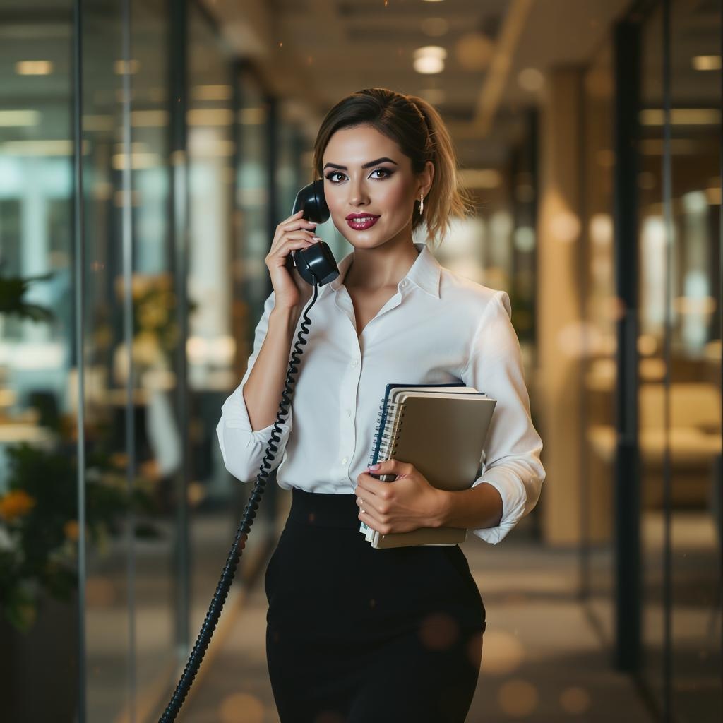 A brunette woman with short hair in a ponytail stands confidently in a modern office, gracefully answering the telephone while wearing an elegant blouse and skirt. She holds notebooks in one hand, exuding professionalism as she strides towards the camera. Captured from a low angle, the scene is bathed in diffused, warm light with a subtle backlighting that creates a gentle bloom and light sparkles. The image showcases vivid chromatic aberration and a smooth, sharp focus, highlighting her dynamic pose. Her eyes are detailed and expressive, adding depth of field and an element of intrigue to the composition.