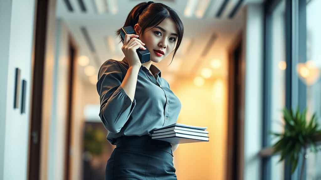 A brunette woman with short hair styled in a ponytail stands in a modern office, elegantly answering the telephone. She wears a sleek skirt and blouse combo, effortlessly holding a stack of notebooks. As she walks towards the camera, the low angle captures her graceful movement in a dynamic pose. The image is detailed and polished, featuring diffused broad light that envelops her figure, with a touch of backlighting creating a subtle bloom effect. Light sparkles gently dance around her, enhanced by a hint of chromatic aberration. Her smooth skin and sharply focused features emphasize her confident demeanor, with particular attention drawn to her expressive, detailed eyes. The composition maintains a sense of depth of field and pristine sharpness, resulting in a masterpiece of modern elegance and professional poise.