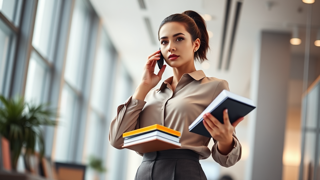 A brunette woman with short hair styled in a sleek ponytail stands confidently in a modern office. She is dressed in an elegant blouse and a tailored skirt, embodying professionalism while exuding charisma. Her stance is dynamic and poised as she engages in a phone conversation, her free hand holding a stack of organized notebooks. The scene is captured from a low angle, offering a sense of empowerment, with a focus on her meticulously detailed features, including her expressive eyes. The image is illuminated with diffused broad light, enhanced by soft backlighting that creates a subtle bloom effect. Light sparkles softly around her, and a touch of chromatic aberration adds artistic flair. The overall composition is smooth yet sharply focused, with a refined depth of field emphasizing the woman as she appears to walk towards the camera.