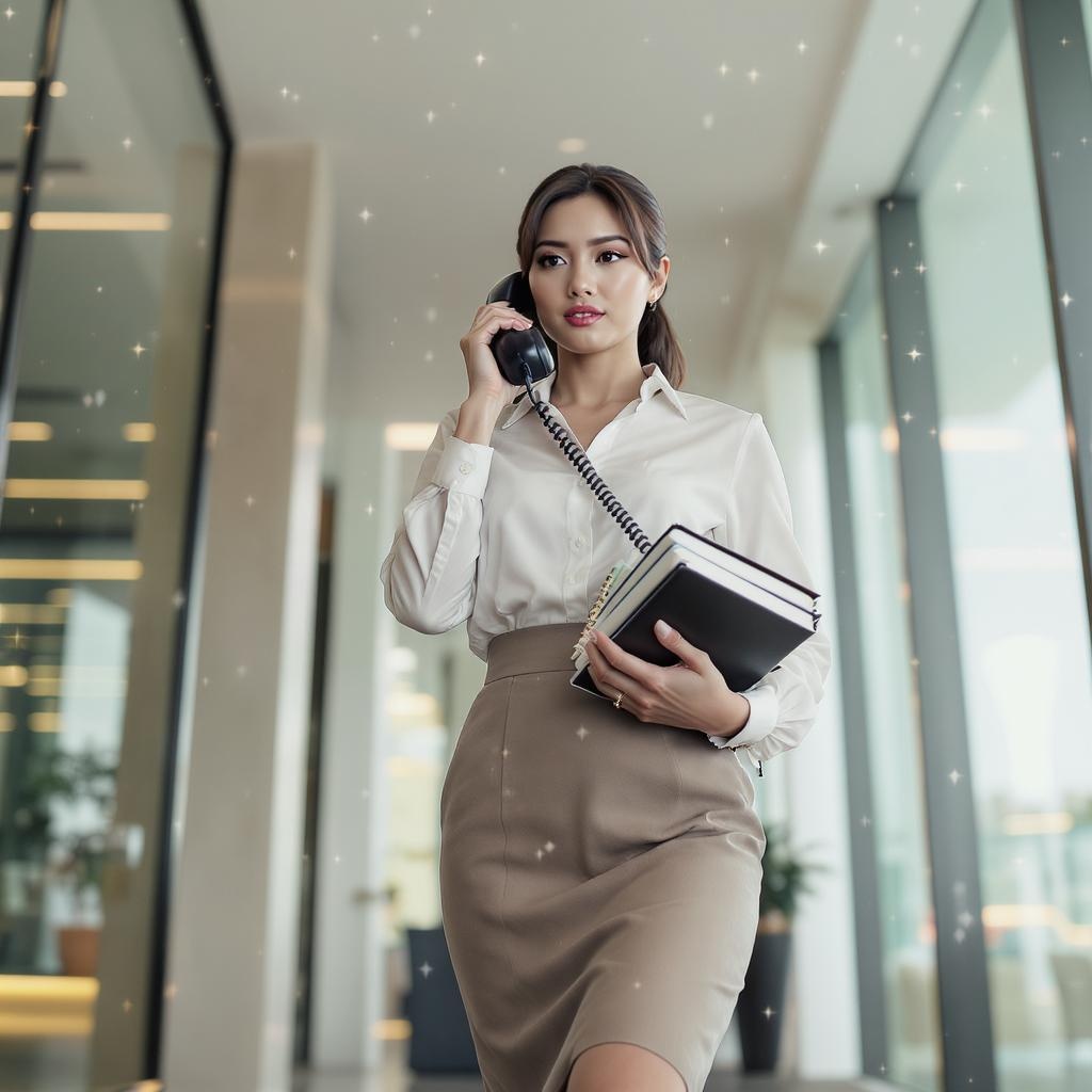 A brunette woman with short hair tied in a sleek ponytail stands in a modern office, gracefully answering the telephone while wearing a sophisticated skirt and blouse. She holds a stack of notebooks, exuding elegance as she walks confidently towards the camera in a dynamic pose. The low-angle shot captures her from below, emphasizing the detailed craftsmanship of her attire and the refined architecture around her. Bathed in soft, diffused broad light with subtle backlighting, the scene sparkles with a gentle bloom effect. Light sparkles subtly dance across the frame, enhanced by delicate chromatic aberration. The focus is sharp, capturing her detailed eyes and expressive features, all set against a smooth backdrop that emphasizes her poised professionalism. The depth of field enhances the scene's immersive quality, making her presence captivating and the office environment rich with texture and detail.