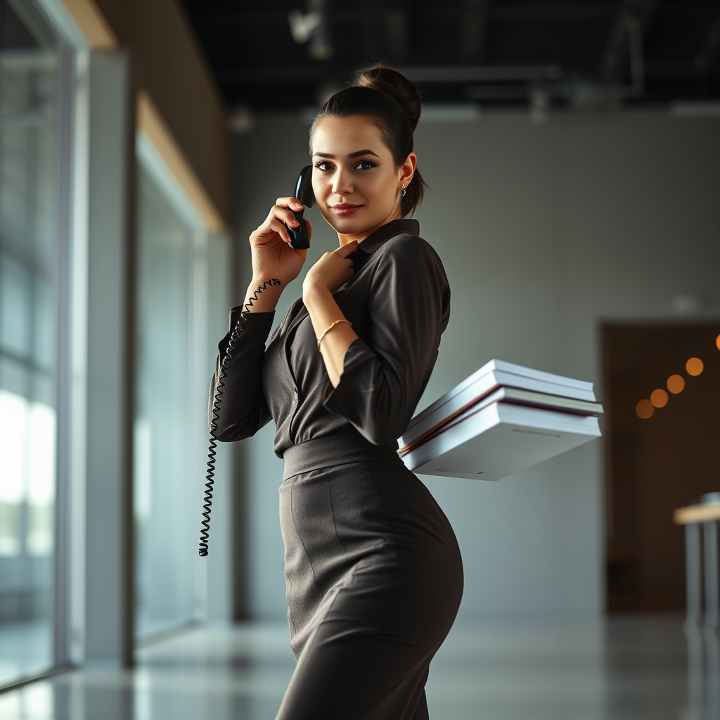 A brunette woman with sleek short hair and a neat ponytail stands gracefully in a contemporary office setting. She is answering the telephone with a composed expression, dressed in a tailored skirt and blouse that exude professionalism. In her other hand, she holds a stack of notebooks, suggesting her readiness for her busy day. The scene is captured as she strides confidently towards the camera, with a low angle shot emphasizing her poise and authority. The lighting is a diffused broad light, creating a sophisticated ambiance with subtle backlighting. A gentle bloom effect adds an ethereal quality, with light sparkles and hints of chromatic aberration enhancing the atmosphere. The sharp focus captures the dynamic pose and the intricate details of her expression, particularly her expressive eyes that convey intelligence. The depth of field highlights her against the background, ensuring she remains the centerpiece of the image.