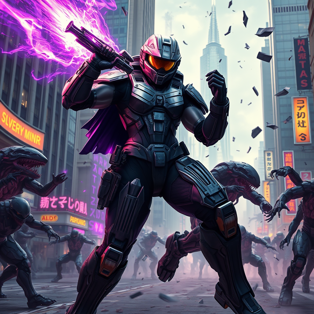 A bulk female warrior in meticulously detailed halo spartan armor fiercely battling an army of extraterrestrial creatures on a chaotic, bladerunner-esque city street. Her perfectly fit physique exudes strength as she strikes an epic action pose, surrounded by a vivid purple aura of flaming energy. Flying debris swirls around her, adding dynamic motion to the scene. The background is a post-apocalyptic city with towering, crumbled skyscrapers and flickering neon signs, evoking a surreal, cinematic atmosphere. Her armor is intricately designed, reflecting a fusion of manga and anime aesthetics, with extreme attention to detail that gives it a highly realistic appearance. The scene is rendered with octane, highlighting the intricate textures and gleaming surfaces of her armor, creating a visually stunning piece trending on artstation.