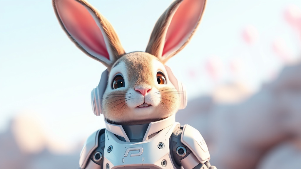 A bunny clad in a futuristic robotic suit, inspired by Pixar's whimsical style, adorned in soft pastel hues. The scene is illuminated with natural, lifelike lighting and shading, showcasing high-quality, ultra-detailed 3D rendering. Utilizing C4D and advanced octane rendering techniques, the image features realistic ray tracing effects, providing an 8k resolution masterpiece.