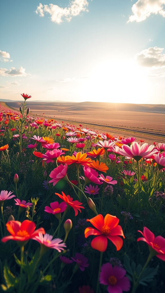 A burst of vibrant joy in the season of renewal, capturing the essence of blooming flowers and fresh beginnings, set against a landscape stretching wide and open, showcasing nature's vivid palette in a canvas of harmony and delight.