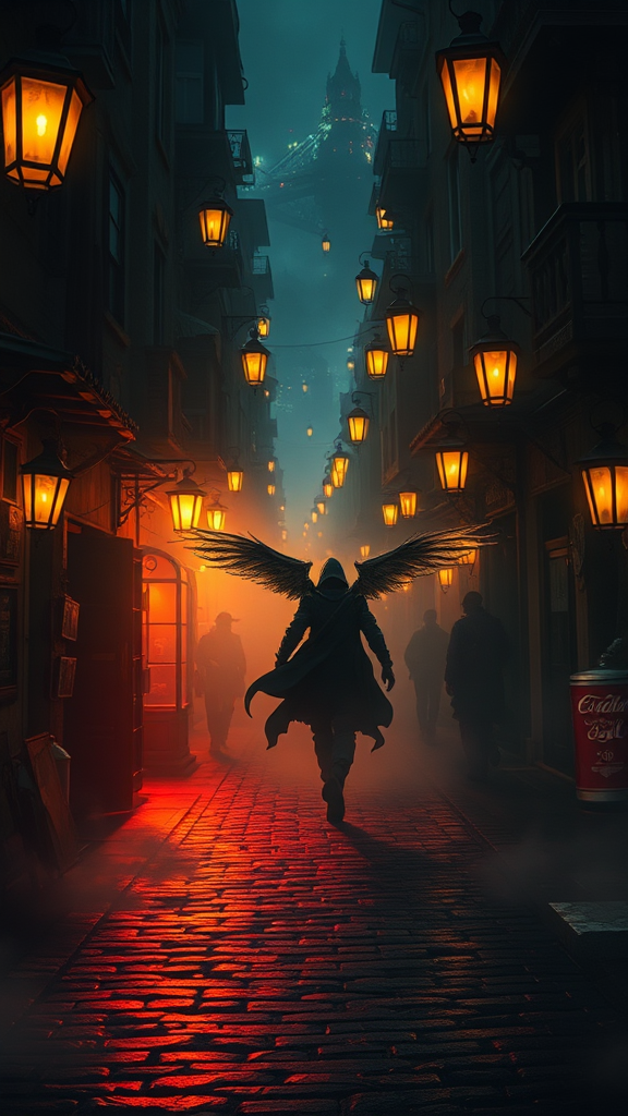 A bustling city of thieves unfolds beneath the misty embrace of night, where cobblestone streets reverberate with clandestine footsteps. Illuminated by the warm glow of rustic lanterns, a lone figure strides confidently through the vibrant, shadow-draped alleys. Each step radiates with intricate design, their movements a dance of grace amidst the chaotic tapestry of the city. Embedded in deep, volumetric lighting, the scene pulsates with energy, casting dramatic shadows that whisper secrets of countless heists and untold fortunes. Mist swirls gently around their feet, enhancing the mystery that cloaks these masters of adaptation. The art is a highly detailed masterpiece, evoking the style of Artgerm, and captivates with its spellbinding depth of field. Fantasy elements peek through, hinting at a world where reality and imagination entwine seamlessly. The ambiance, trending on art platforms, commands attention, immersing the viewer in a realm where every detail—down to the extra wings and subtle distortions of form—tells its own story amidst the captivating chaos of an otherworldly metropolis.