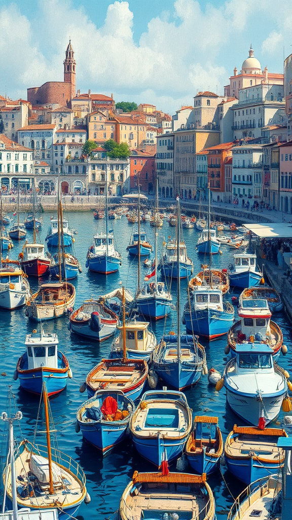A bustling city port scene, where vibrant blue fishing boats clutter the harbor waters, teeming with life against a backdrop of charming coastal architecture. Painted in the style of snapshot aesthetic blended with Claude Monet's impressionism, the scene captures the lively movement and atmospheric light, with authentic details that bring the coastal landscape to life, framed in a harmonious vertical composition.