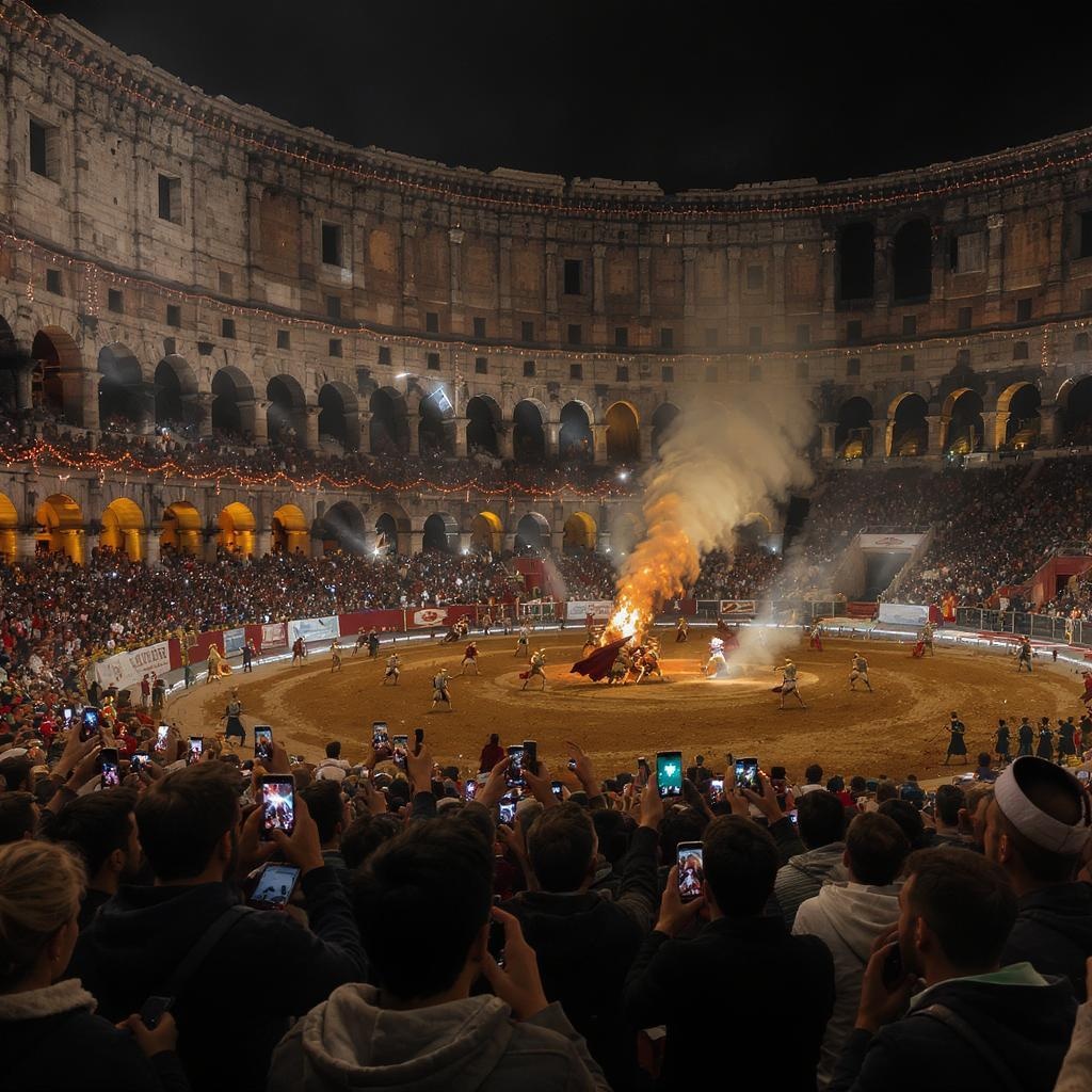 A bustling crowd of people, each engrossed in their phones, capturing the fierce intensity of gladiator fights within the ancient Roman Colosseum. The scene is depicted in ultra-realistic detail, blending historical grandeur with a modern twist. The atmosphere is infused with xmaspunk elements, as festive lights and decorations subtly intertwine with the monumental architecture, casting a vibrant glow over everything. The contrast between ancient warriors clashing in the arena and spectators wielding the latest technology creates a captivating juxtaposition, highlighting the timeless allure of spectacle and celebration in the heart of the Roman Empire.