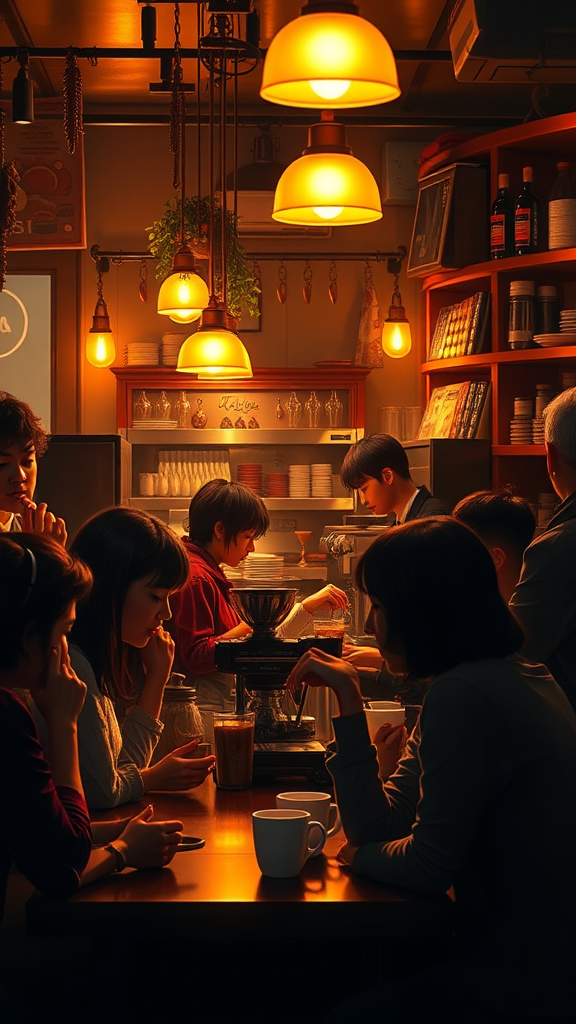 A bustling evening scene in a cozy café filled with young people savoring rich coffee, under warm, cinematic lighting that enhances the inviting atmosphere. The skilled barista stands behind the counter, expertly crafting beverages amid the ambient glow of the café. The scene is captured in vivid, ultra-detailed digital art, rendered with stunning realism and depth. The style reflects a combination of the whimsical charm of Studio Ghibli and the dramatic, photorealistic painting techniques of artists like Jeremy Mann and Greg Manchess. A masterful blend of colors brings the lively environment to life, with intricate details and sharp focus giving a sense of presence and immediacy. The setting evokes a sense of cozy intimacy and vibrant social energy, drawing inspiration from trending concepts on ArtStation and CGSociety. The image captures a moment of relaxed enjoyment and camaraderie, making it a majestic, professional piece that resonates with hyperrealistic vibrancy and creativity.