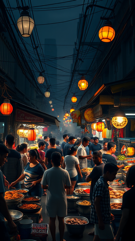 A bustling Malaysian roadside street food scene, where vibrant stalls brimming with steaming dishes draw in a diverse crowd of people, captured in a hyper-realistic style. The atmosphere is infused with a moody, atmospheric tone, as shadows and dark colors mingle with the warm glow of lanterns and the sizzle of cooking food, creating an inviting yet mysterious ambiance. Aromas of spices and grilled meats fill the air, adding an irresistible allure to this vivid culinary tapestry.