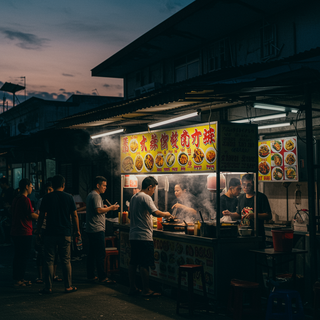 A bustling Malaysian street food stall at twilight, with soft, ambient lighting casting warm shadows over the scene; the rich aroma of spices fills the air as people gather, chatting animatedly while eagerly awaiting their orders. The stall's colorful signage contrasts with the dark, moody tones of the evening, creating a lively yet intimate atmosphere. Steam rises from sizzling grills, and the clatter of woks blends with the melody of distant traffic, painting a vivid, hyper-realistic portrayal of this vibrant culinary experience.