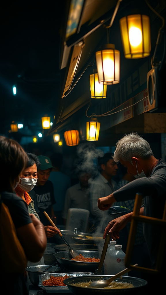 A bustling Malaysian street food stall illuminated by dim, flickering neon lights. The air is thick with the rich aroma of sizzling satay and char kuey teow. Patrons, cloaked in shadows, gather closely under the protective canopy, their faces illuminated by the warm, golden glow of lanterns. The vendor, an elderly man with weathered hands, expertly tosses ingredients in a wok, while steam billows and curls around him. In the background, a tapestry of moody, dark hues adds depth, enveloping the scene in a sense of intimacy and intrigue.