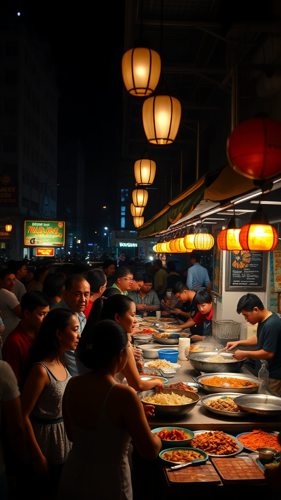 A bustling Malaysian street food stall is illuminated by the warm glow of hanging lanterns, casting a moody ambiance over the scene. The air is rich with the sizzling aroma of satay and char kway teow, as a diverse crowd of people gathers, their faces animated with anticipation. Shadows play off tables cluttered with colorful plates of nasi lemak and spicy laksa, while vendors skillfully maneuver woks and grills. The ambiance is set against the backdrop of a vibrant urban setting, where the dark, muted tones of the night create a striking contrast with the lively energy of this culinary haven.