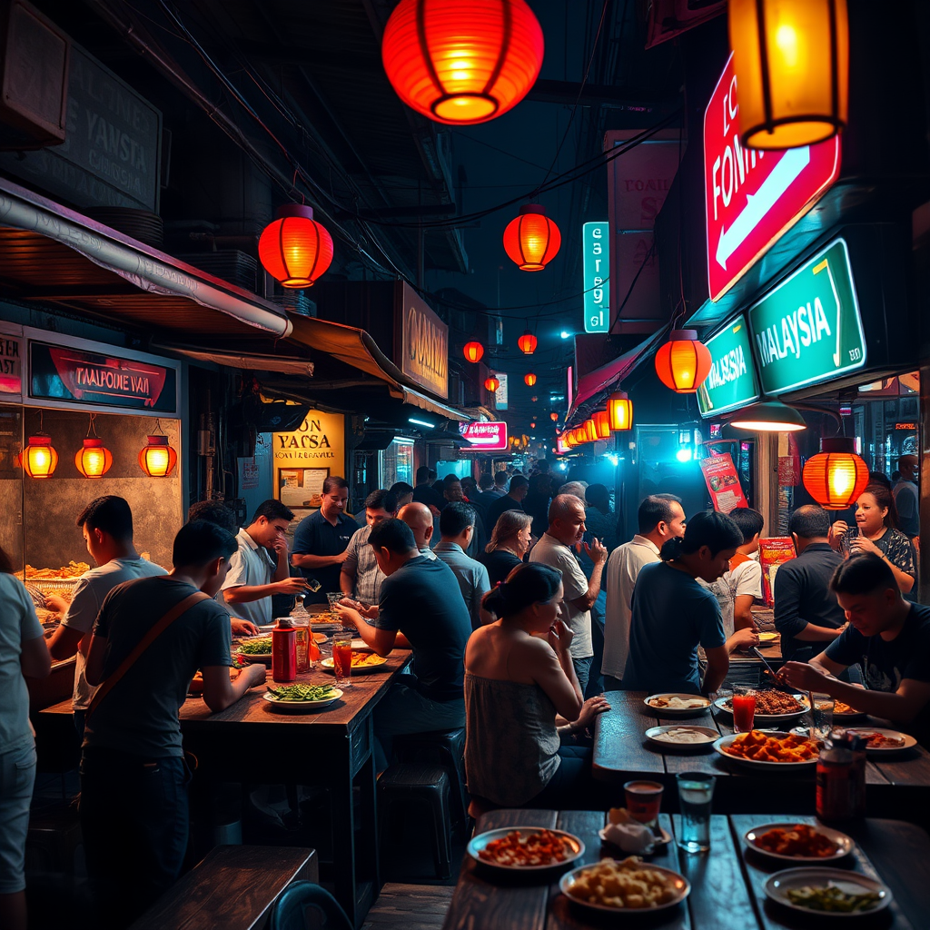 A bustling Malaysian street food stall, where the flickering lanterns cast warm, moody glows on the array of sizzling dishes. The air is thick with the mouthwatering aroma of spices and grilled meats, as a diverse crowd of people gathers, their faces illuminated by the shop's vibrant neon signs. Shadows dance across weathered wooden tables laden with colorful plates of authentic cuisine, while the night hums with the sounds of laughter, clinking glasses, and soft chatter, all set against a backdrop of the bustling city in dusky hues.