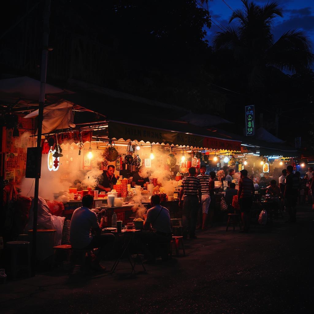 A bustling Malaysian street-side food stall at dusk, with vibrant aromas filling the air, illuminated by dim, warm lighting casting long, dramatic shadows. People gather eagerly around small tables, enjoying steaming dishes under the canopy of deep blue twilight. Rich, moody hues dominate the scene, capturing the essence of a lively, yet intimate atmosphere. Patrons chat animatedly, their faces glowing with the anticipation of authentic culinary delights, as a light breeze rustles through the nearby palm trees, adding to the enchanting ambiance.
