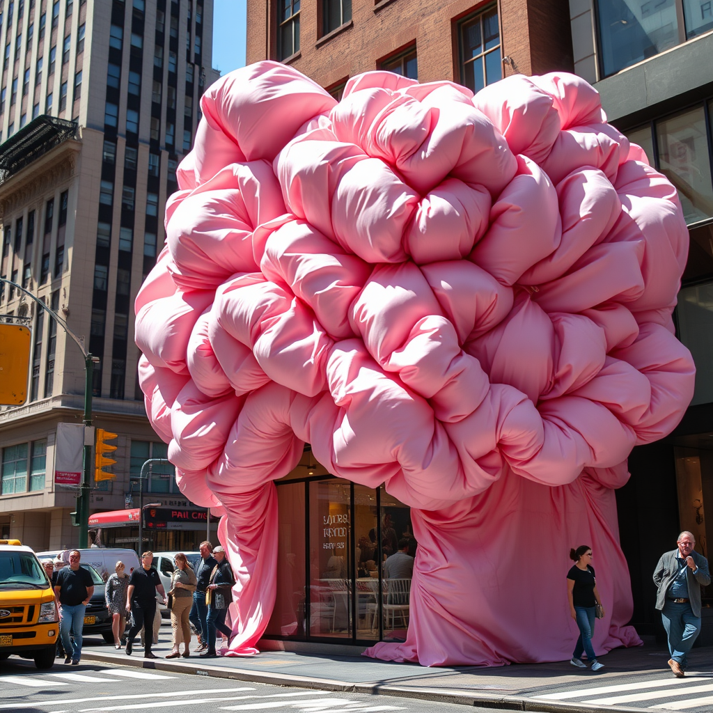 A bustling New York city street showcases an extravagant boutique with an entire facade enveloped in a luxurious, exaggeratedly puffy pink silk fabric. The silk billows with dramatic volume, creating an eye-catching spectacle among the urban landscape. Every fold and crease of the fabric is captured in minute, intricate detail, highlighting the texture and softness of the silk. Sunlight dances on the surface, casting delicate shadows that accentuate the silk's rich hues. The opulence of the display contrasts starkly with the surrounding architecture, drawing admiring glances from passersby. The scene is captured in a photo of exceptional quality, vividly portraying the vibrant and whimsical presence of this disproportionate textile marvel amidst the city bustle.