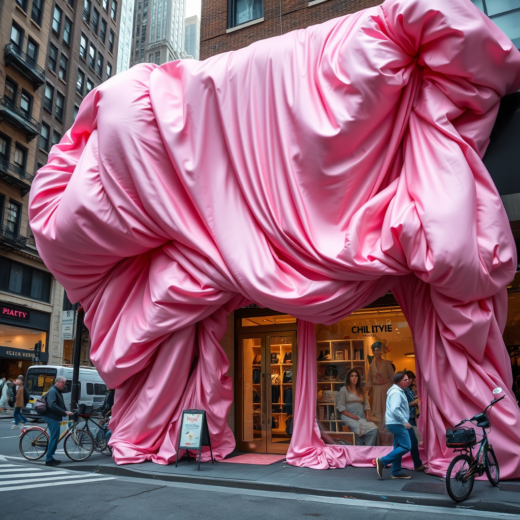 A bustling New York city street where the facade of a chic boutique is draped in luxuriant pink silk, billowing with excess and extravagance, making it appear delightfully oversized and whimsical. The fabric's plush, cloud-like folds cascade elegantly, capturing every minute detail with stunning clarity, creating a captivating scene in high resolution and remarkable detail. Playful touches include delicate embroidery and subtle glimmers of gold thread woven throughout, enhancing the opulent texture. The visual harmony of the scene is both imaginative and vibrant, embodying a sense of artistic fantasy amidst the urban landscape.
