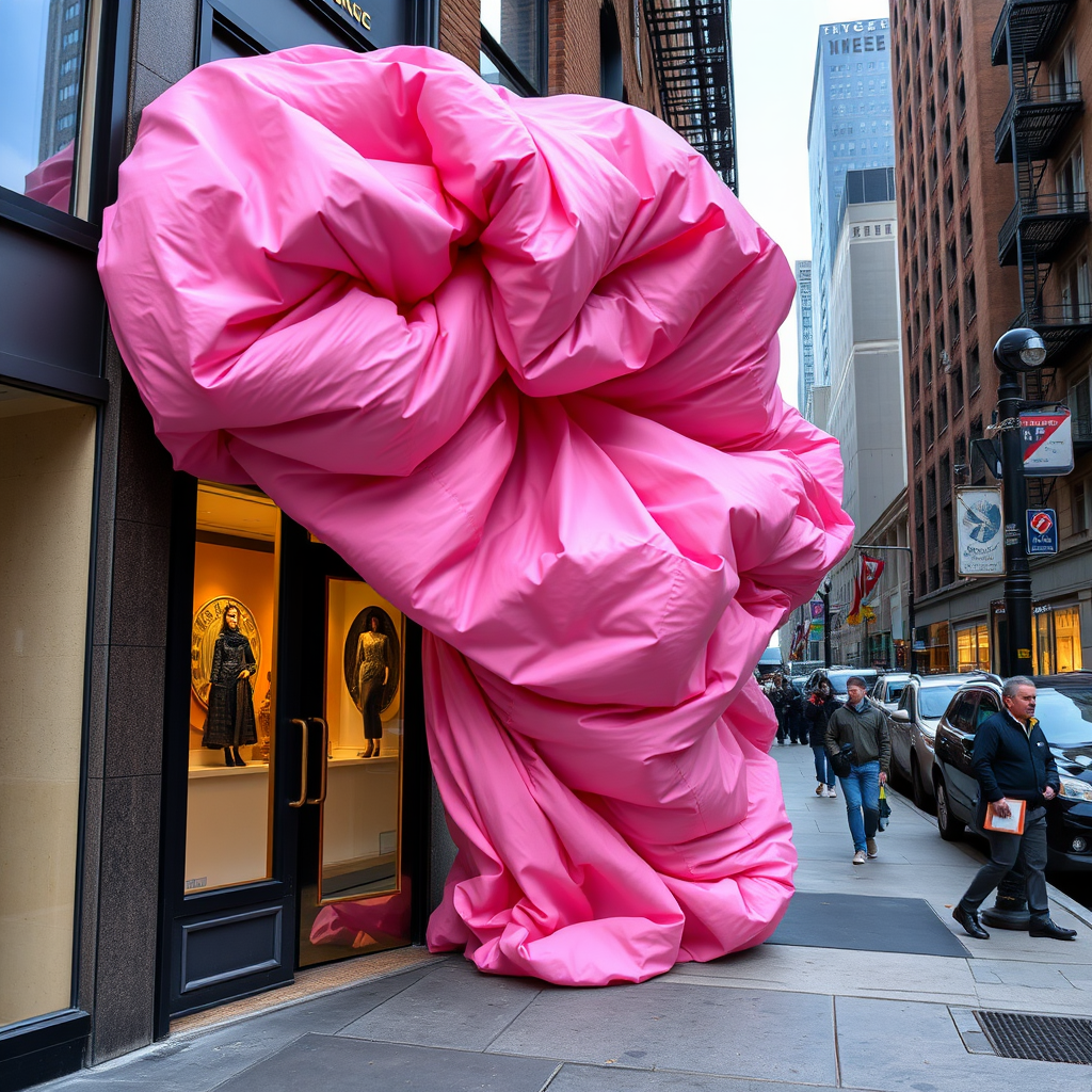 A bustling New York city street, where the facade of a chic boutique is enveloped in an oversized, luxuriously puffy pink silk fabric, which billows dramatically, capturing the eye. Every stitch and fold of the fabric is captured in exquisite detail, creating an interplay of light and shadow that highlights its opulence. The vibrant pink stands out against the urban landscape, bringing a touch of whimsical elegance to the scene. This high-quality photo showcases the seamless blend of city grit and fashion fantasy, speckled with reflections in nearby windows and the subtle texture of the sidewalk below, all captured in vivid clarity.