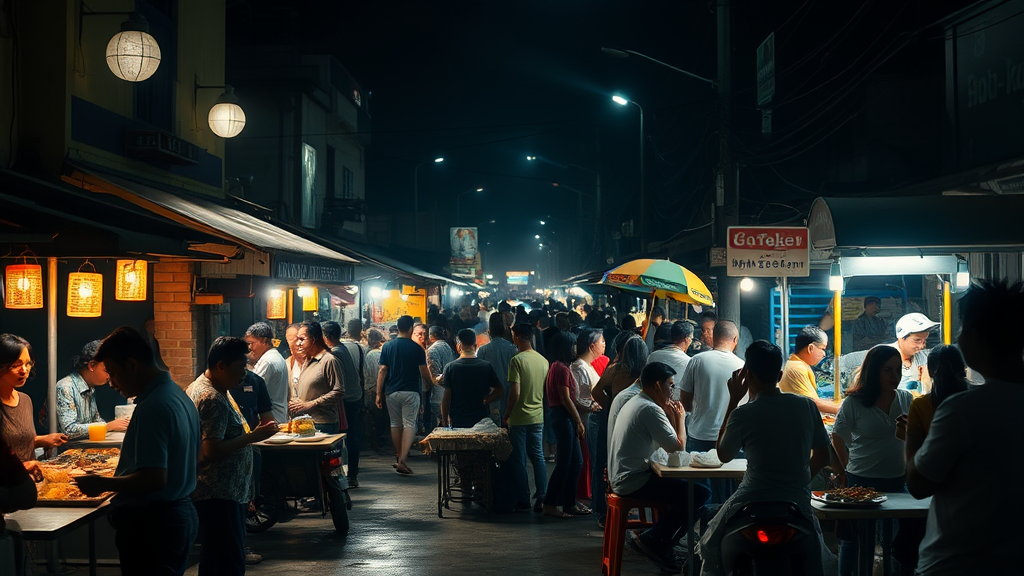 A bustling night scene of a Malaysian roadside food stall, illuminated by the soft glow of overhead bulbs. The air thick with the aroma of sizzling street food, a diverse crowd of people, both locals and tourists, gather around small tables. The scene captures the rich textures and dark, moody tones of a tropical night, with subtle reflections on wet pavement. The vibrant colors of traditional dishes contrast against the dimly lit surroundings, echoing the lively yet intimate atmosphere.