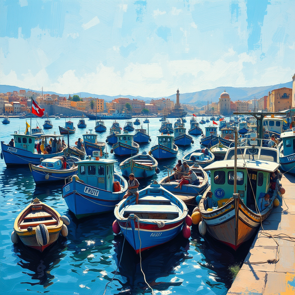 A bustling scene at Boukaabka Port, with blue fishing boats gently swaying in the water, capturing the lively essence of a coastal city. The composition reflects the snapshot aesthetic infused with the impressionistic brushwork reminiscent of Claude Monet, highlighting authentic details such as the shimmering light on the water and the vivid hues of the boats and surrounding landscape. The city scene is a harmonious blend of vibrant colors and dynamic movement, evoking the charm and vitality of a thriving port town amidst an idyllic coastal panorama.