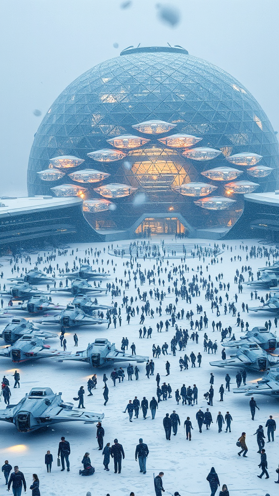 A bustling spaceport sprawls with a variety of spaceships, their sleek forms gleaming under the artificial lights. Clusters of people, clad in futuristic attire, move purposefully across the snow-dusted ground. Dominating the backdrop is an imposing, dome-shaped structure, crafted from an elegant fusion of white stone and transparent glass, giving it an ethereal glow. The building's surface reflects the delicate dance of lights from the ships and the occasional snowflake floating down. This busy scene captures the spirit of a future where technology and architecture blend seamlessly against a wintry panorama.