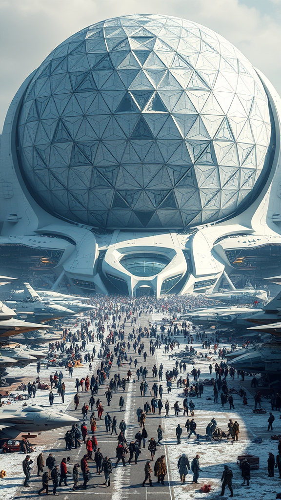 A bustling spaceport teeming with spaceships of various designs, with crowds of people moving purposefully across the area. Towering before it is an awe-inspiring futuristic structure, a vast dome crafted from sleek white and grey stone interlaced with shimmering glass panes. The ground is blanketed with a light scattering of snow, adding a stark contrast to the metallic and stone surfaces. The scene captures an atmosphere of organized chaos and technological marvel, reminiscent of Craig Mullins' raw and vivid artistic style.