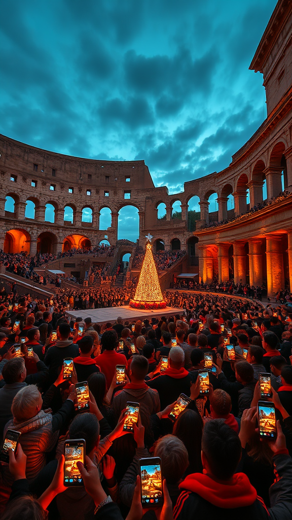 A bustling throng of people in the Roman Coliseum, each clutching smartphones, capturing hyper-detailed moments of gladiator battles, blending elements of the Roman Empire with a festive xmaspunk twist, intricate details highlighting the juxtaposition of ancient architecture and modern technology under a twilight sky, with Christmas lights subtly woven into the ancient structure's columns, the scene bursting with vibrancy and a surreal blend of time periods, focusing on textures and realism throughout.