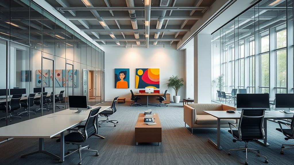 A candid capture of a modern office environment featuring an open layout with sleek lines and ergonomic furniture. The space is defined by glass walls that offer transparency and connectivity. The neutral color scheme is punctuated by bold and vibrant art pieces, adding a splash of creativity to the minimalist design. Studio lighting enhances the clean lines and the overall ambiance, creating a warm and inviting atmosphere. The vertical aspect ratio accentuates the height and spaciousness of the area, emphasizing the contemporary aesthetic.