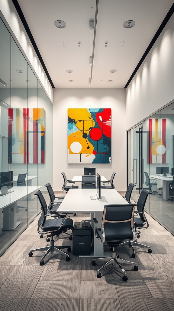 A candid image of a modern office environment featuring minimalist design, ergonomic furniture, and elegant glass partitions. The space is defined by sleek architectural lines and a neutral color palette, accented by vibrant abstract artwork that adds a dynamic splash of color. The room is softly illuminated with studio-style lighting, enhancing the overall aesthetic and professional ambiance.