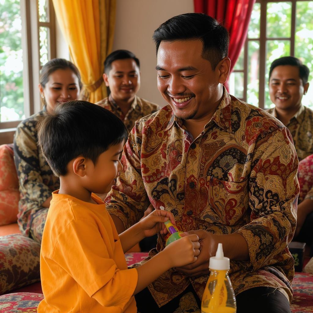 A candid moment captures an Indonesian man in his 30s, wearing a richly detailed batik shirt, laughing warmly as he helps his young son with a playful task. The bright, traditional living room is filled with natural morning light, highlighting the intricate design of the batik and the vibrant colors of the room. Other family members are seen in the background, smiling, their faces expressing genuine joy. Their traditional clothing is adorned with elaborate patterns, each piece telling its own story. The focus is on capturing the raw, heartfelt connection of the family in their lively setting.