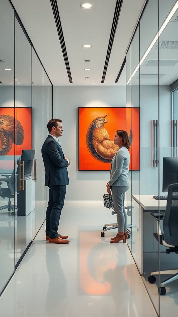 A candid moment in a minimalist office space featuring ergonomic design, with sleek glass walls and modern lines. The neutral color palette is punctuated by bold, vibrant artworks, illuminated under studio lighting.